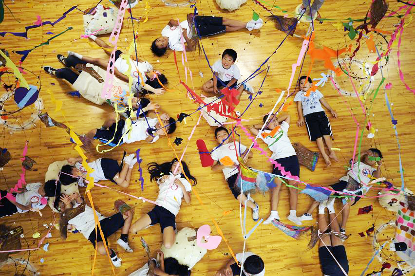 今回の授業は、居心地の良い場所=「巣」をテーマに、ボタンのついたゴムひもを教室に張りめぐらし、布や紀美野町産のシュロをボタンにひっかけて、教室いっぱいにひろがる大きな巣をみんなでつくりました。授業の途中からは見学にこられた家族や地域の方も製作に参加しました。完成した巣は8月31日(金)まで公開し、児童や作品を見に来たご家族や地域の方も、布やシュロを使って巣をつくることができます。巣づくりを通して創造する楽しさを味わい、地域特産物や身近にある物の魅力を発見すると共に、製作や展示を通して家族や地域の人とのつながりを感じる授業です。その様子をご報告します!